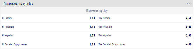 Отметим, что именно Украина имеет наибольшие шансы квалифицироваться на ЧЕ по пути В (коэффициент – 2.05).