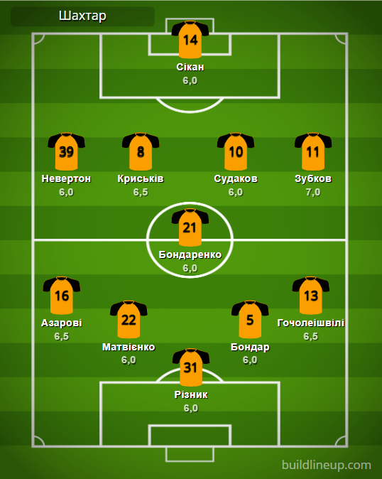 «Шахтер»: Резник – Азаров, Матвиенко, Бондарь, Гочолеишвили – Бондаренко – Невертон (Эгиналду, 61), Крыськив (Назарина, 64), Судаков, Зубков (Кащук, 89) – Сикан (Келси, 61).