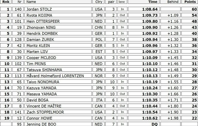 19-летний Столц стал единственным спортсменом, который выбежал из 1 минуты и 9 секунд и немногим более 0.1 секунды не дотянул до рекорда трека. А ближайшему сопернику, японцу Рете Кодзиме, американец «привез» более секунды отрыва. Замкнул первую тройку нидерландский ветеран, 35-летний Хейн Оттерспер.
