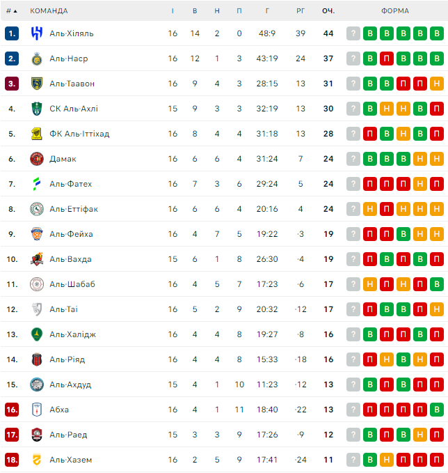 Лидеры чемпионата: Аль-Хиляль (44), Аль-Наср (37), Аль-таавун (31), Аль-Ахли (30), Аль-Иттихад (28).