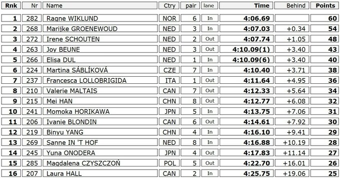 Норвежка выиграла третью гонку на этой дистанции в нынешнем сезоне, стала единственной спортсменкой, которая выбежала из 4 минут и 7 секунд и «привезла» ближайшей сопернице, Мерайке Хруневауд из Нидерландов, 0.34 секунды разницы. Третье место заняла одна из лучших в мире специалисток по длинным дистанциям, еще одна нидерландка Ирен Схаутен.