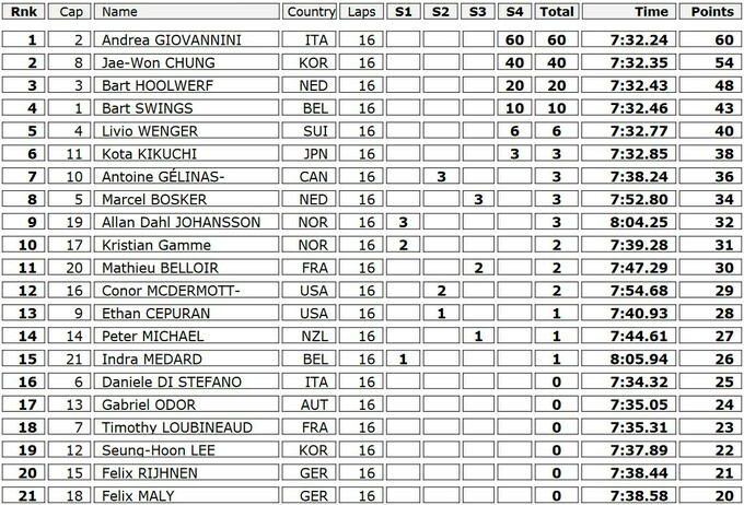 В финишном спринте 30-летний Джованнини смог удержать первое место в борьбе с южнокорейцем Чханом Дже Оном, ставшим вторым, и нидерландским специалистом по масс-стартам Бартом Холверфом, который финишировал третьим, всего на 0.03 секунды опередив действующего и пятикратного обладателя Кубка мира в масс-старте, бельгийца Барта Свингса.