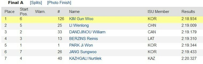 В финале лидер зачета Кубка мира немногим менее, чем на 0.1 секунды опередил местного шорт-трекиста Ли Веньлуна. А третьим стал канадец Вильям Данджину, одно из открытий нынешнего сезона.