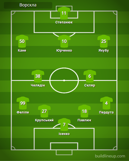«Ворскла»: Исенко – Фелипе, Крупский, Павлюк, Пердута – Челядин (Бацула, 73), Скляр (Черныш, 90+3) – Кане, Юрченко, Якубу (Нестеренко, 72) – Степанюк.