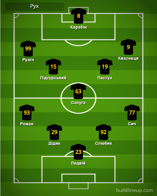 «Рух»: Ледвий – Роман, Дидык, Слюбик, Сыч – Пидгурский, Сапуга, Пастух – Рунич (Лях, 52), Карабин (Эдсон, 69), Квасница (Альваренга, 70).