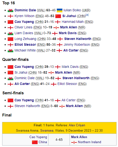 Победителем турнира стал Марк Аллен из Северной Ирландии, победивший в финале китайца Цао Юйпэна (65:4).