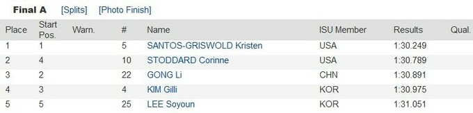 В финале со старта вперед вышла Коринна Стоддард, однако в середине дистанции ее опередила Кристен Сантос-Грисволд. Лидер команды США без проблем довела забег до своей победы, а Стоддард надежно отработала в защите и впервые в карьере заняла второе место на этапе Кубка мира. Третьей финишировала местная шорт-трекистка Гун Ли, которая смогла удержать за собой кореянку Ким Гиль Ли.
