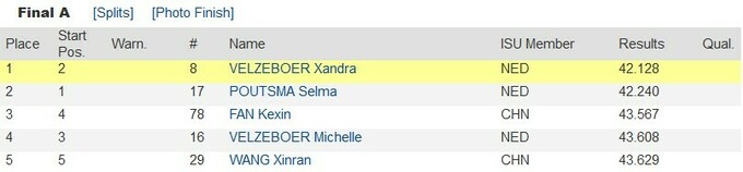 В финале Фелзебур и еще одна нидерландка Селма Паутсма быстро убежали далеко вперед. Какое-то время Паутсма была лидером, но Фелзебур ее обогнала. Ставшая третьей пятикратная чемпионка мира Фань Кесинь отстала от Паутсмы более, чем на 1.3 секунды.