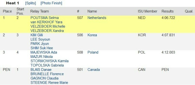 В женской эстафете победили нидерландки Селма Паутсма, Мишелле Фелзебур, Ксандра Фелзебур и Яра ван Керкхоф. Шорт-трекистки из Нидерландов таким образом выиграли вторую эстафету подряд в нынешнем сезоне. Вторыми стали спортсменки из Южной Кореи, а третьими — спортсменки из Польши.