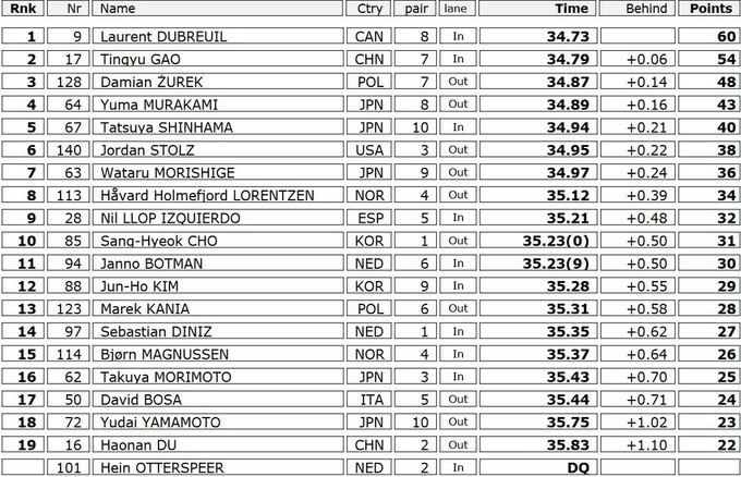 Для Дюбрея эта победа стала первой в нынешнем сезоне. Вторым с отставанием в 0.06 секунды стал китаец Гао Тинюй, а третье место занял представитель хозяев льда Дамиан Зурек, который вошел в призовую тройку впервые в нынешнем сезоне.