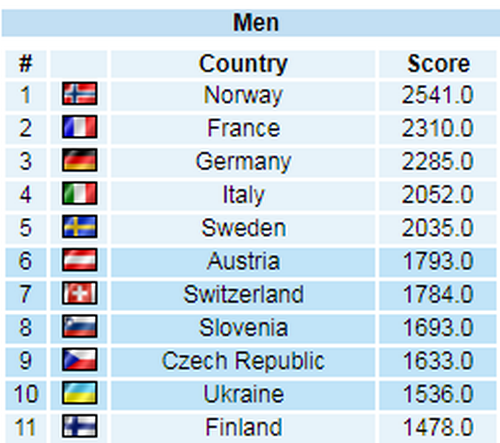 В Кубке наций, конечно, Норвегия впереди, имея после двух этапов 231 очко преимущества над французами. Третьи здесь, как и в эстафете, немцы.
