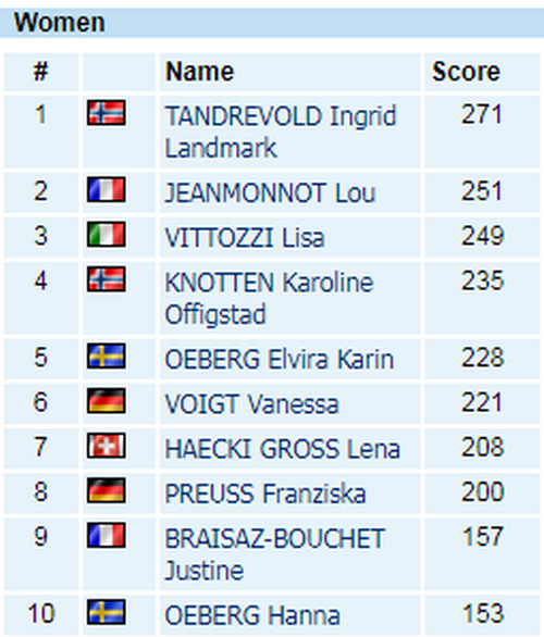 У Ингрид Тандреволд все же есть повод для радости, ведь после всех проблем в персьюте она по итогам двух этапов возглавляет общий зачет Кубка мира с двадцатиочковым преимуществом над Лу Жанмонно. Третьей совсем рядом с француженкой идет Виттоцци. Эльвира Эберг продолжает прокладывать себе путь наверх, пока она пятая, и до лидера 43 пункта.