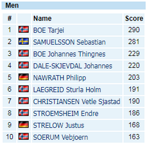 В личном зачете Кубка мира благодаря двум удачным гонкам на первую позицию выбрался Тарьей Бё. За ним держится Самуэльссон, а Бё-младший уже третий! Правда, пока с 61-очковым отставанием от лидера. Стоит отметить и то, что в топ-10 7 (!) норвежцев. То есть, все участвовавшие в первых двух этапах сезона. Борьбу за Кубок наций, похоже, можно закрывать уже сейчас.