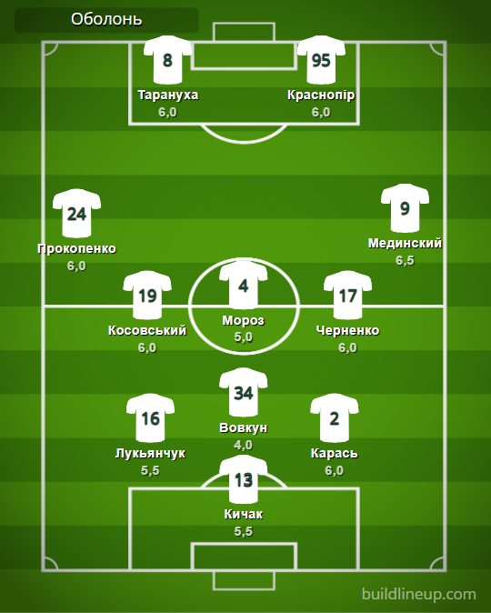 «Оболонь»: Кичак – Прокопенко, Лукьянчук, Вовкун, Карась, Мединский – Косовский (Нагиев, 46), Мороз, Черненко – Тарануха (Груша, 70), Краснопир (Суханов, 80).