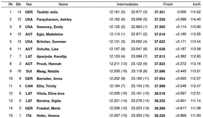 Таубитц не была лучшей ни на одной из двух промежуточных отметок, но на финише стала первой с отрывом почти в 0.1 секунды от американки Эшли Фаркуарсон, которая заняла второе место. Замкнула призовую тройку еще одна саночница из США Эмили Суини, которая была первой на второй промежуточной отметке.
