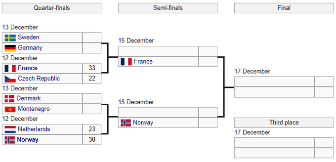 В полуфиналы пробились команды Франции (выигрыш у Чехии 33:22) и Норвегии (победа над Нидерландами 30:23).