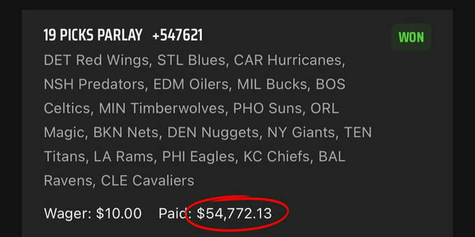 Ставки были на матчи НХЛ, НБА и НФЛ. Беттер правильно спрогнозировал все 19 исходов.