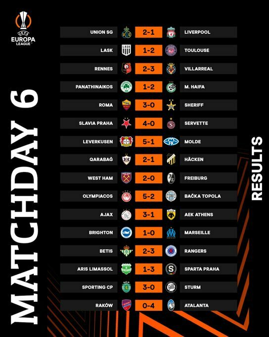 14 декабря прошли заключительные поединки 6-го тура Лиги Европы 2023/24.