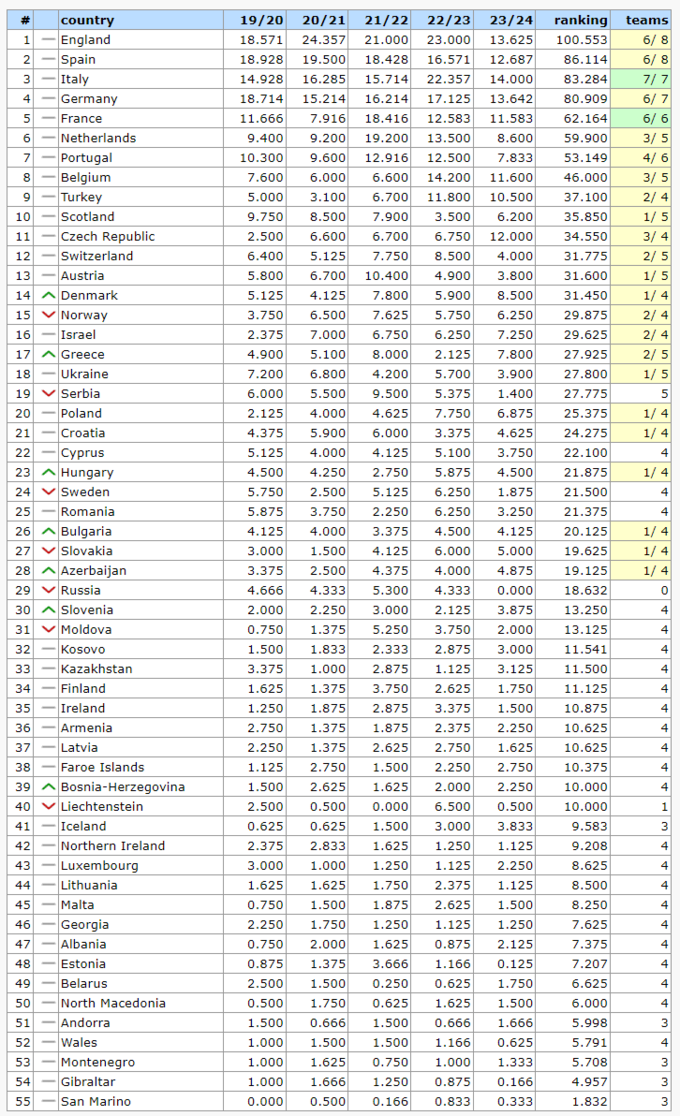 Страны, которые в конце сезона 2023/24 окажутся вне топ-15 по итогам 5-летнего рейтинга, останутся лишь с 4-мя командами в еврокубках и всего с одним представителем в квалификации Лиги чемпионов.