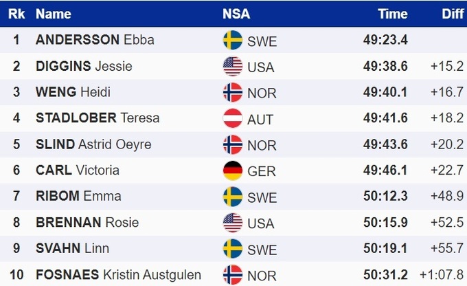 Шведская лыжница Эбба Андерссон выиграла скиатлон на 20 км на этапе Кубка мира в норвежском Тронхейме. Она опередила лидера Кубка мира, американку Джессику Диггинс, и хозяйку трассы, норвежку Хейди Венг.