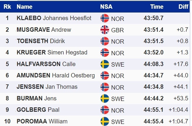 В финишном спринте Клэбо опередил британца Эндрю Масгрейва и партнера по сборной Норвегии Дидрика Тонсета.