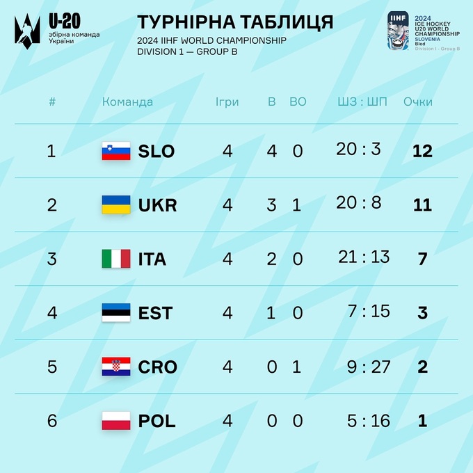 После четырех матчей группового этапа словенцы лидируют с 12 очками, Украина набрала 11 пунктов. Для повышения в классе украинским хоккеистам нужна только победа.