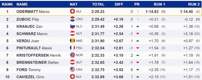 Швейцарский горнолыжник Марко Одерматт выиграл первый гигантский слалом на этапе Кубка мира в итальянской Альта Бадии. В упорной борьбе он опередил хорвата Филипа Зубчича, остальные соперники проиграли двум лидерам более двух секунд.