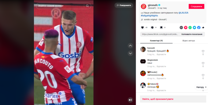 TikTok-аккаунт «Жироны» разместил на своей странице видео празднования Артема Довбика, сделав подпись на украинском языке.