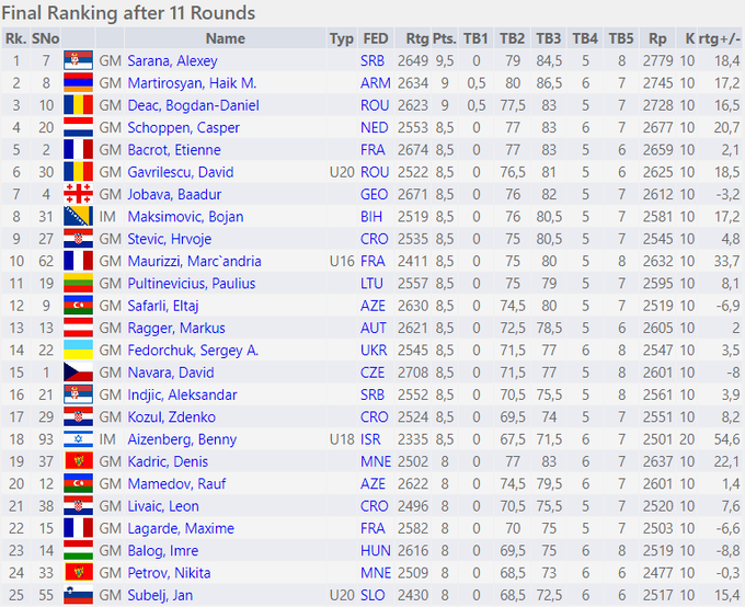 - 1. Алексей Сарана (Сербия) – 9,5 очков из 11