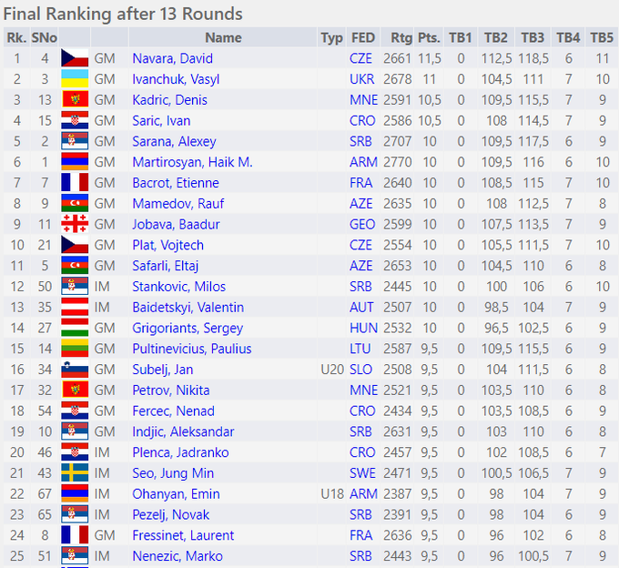 - 1. Давид Навара (Чехия) – 11,5 очков из 13