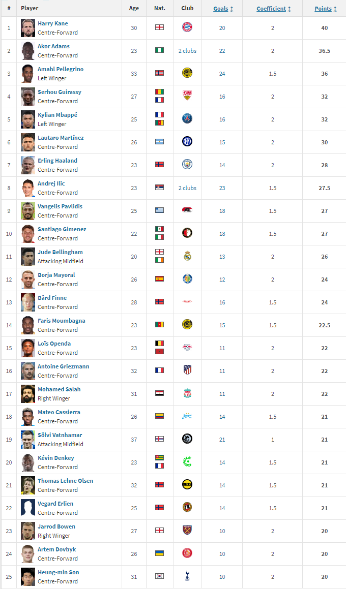 Норвежский форвард «Ман Сити» Эрлинг Холанд (обладатель Золотой бутсы прошлого сезона) забил 14 голов (28 очков) и занимает 7-е место, позади Лаутаро Мартинеса из И«нтера» (15 мячей, 30 очков)