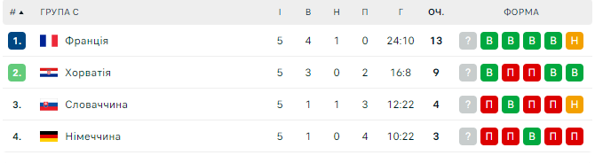 Сборная Франции досрочно выиграла свою группу, одержав 4 победы и 1 ничью в 5 матчах.