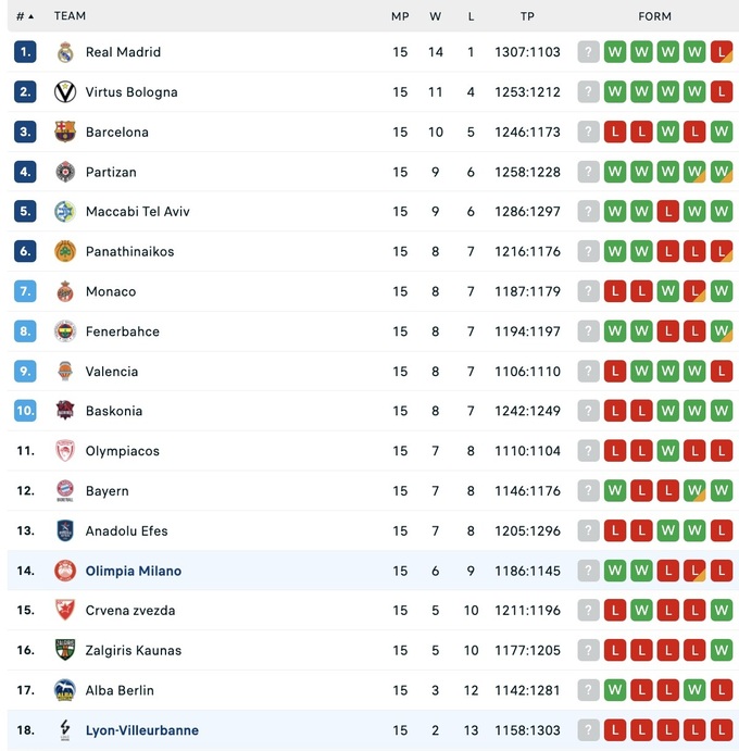 Евролига. Регулярный чемпионат, 15-й раунд. 20 декабря.
