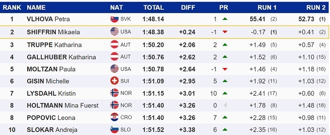 Влхова в упорной борьбе опередила американку Микаэлу Шиффрин. Третьей стала австрийка Катарина Труппе.