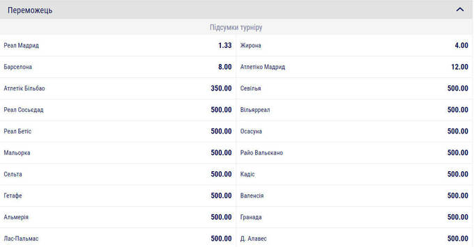 Котировки на титул жиронцев обрушились в 312,5 раз со старта текущей кампании чемпионата Испании. Перед началом сезона коэффициент на трофей «Жироны» составлял 1250.00.