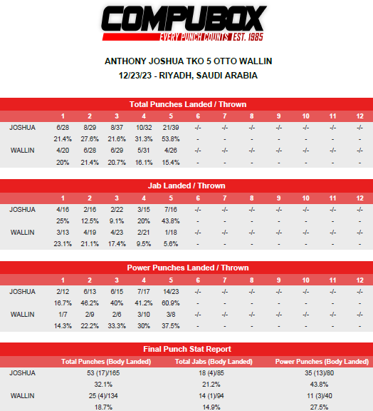 Джошуа превзошел Валлина во всем: по количеству мощных ударов (35–11), по количеству джебов (18–14) и общему числу ударов, достигших цели (53–25).
