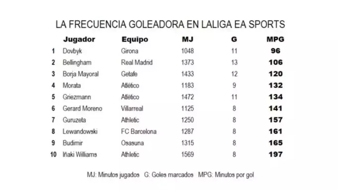 По информации испанского издания Sport, Довбику в среднем нужно 96 минут для забитого мяча в этом сезоне испанского чемпионата. Украинец единственный в списке лучших голеадоров лиги, кому нужно менее 100 минут на гол. Вторым в этом рейтинге является лучший бомбардир чемпионата Джуд Беллингем, забивающий каждые 106 минут.