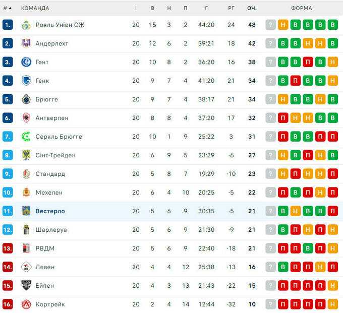 Таблица чемпионата Бельгии 2023/24 после 20-го тура
