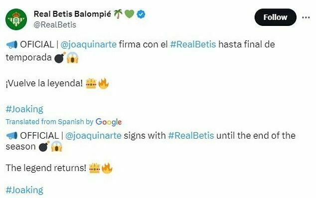 «Официально. Хоакин заключил с «Бетисом» контракт до конца сезона. Легенда возвращается!» – написали представители «зелено-белых» на своих страницах в соцсетях.