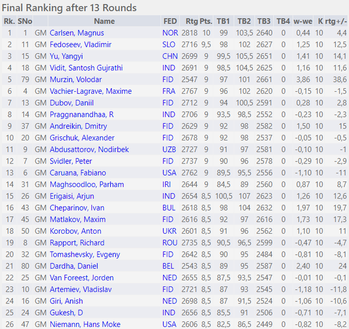 В 13 партиях норвежский гроссмейстер набрал 10 очков и не потерпел ни одного поражения при семи победах и шести ничьих. На пол-очка отстал от него Владимир Федосеев, который выступает за Словению. У него также семь побед, но при одном поражении — от Карлсена. Замкнул призовую тройку китаец Ю Янйи с девятью очками при пяти победах и восьми ничьих.
