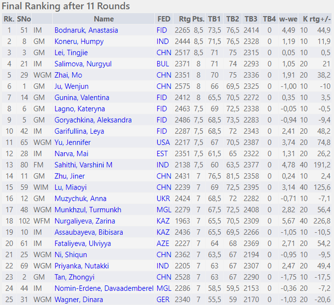 У женщин чемпионкой мира стала Анастасия Боднарук, которая на тай-брейке обыграла Хампи Конеру из Индии (2.5:1.5). Лучшей из украинок стала Анна Музычук, которая с семью очками при четырех победах заняла 16-е место. Мария Музычук – 49-я, Анна Ушенина – 50-я, Наталия Букса – 65-я.