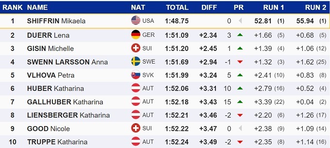 Американская горнолыжница Микаэла Шиффрин с разгромным преимуществом в 2,34 секунды выиграла слалом на этапе Кубка мира в Линце. Это седьмой самый большой разрыв между первым и вторым местом в слаломе на женском Кубке мира.