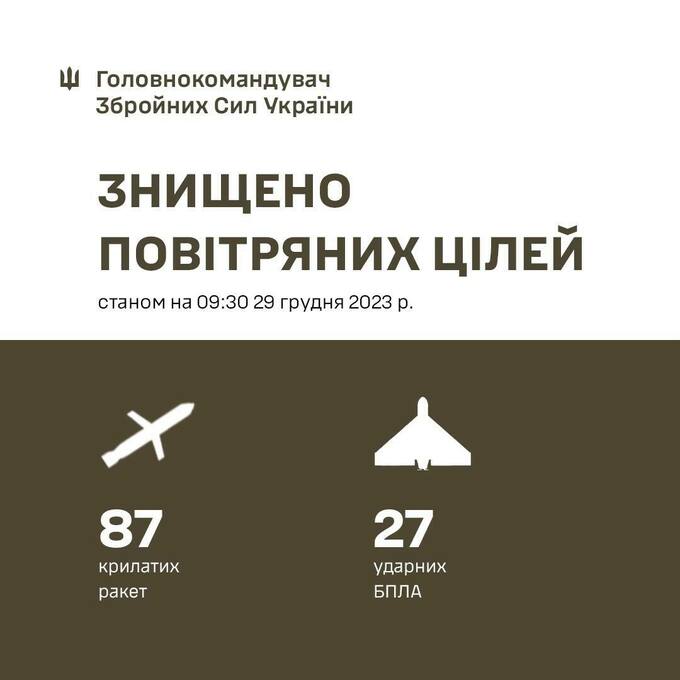 Главнокомандующий ВСУ Валерий Залужный рассказал о том, что ночная и утренняя атака российских террористов состояла приблизительно из 90 крылатых ракет Х-101/Х-555/Х-55, пяти ракет Кинжал, других типов ракет и 36 Шахедов (всего 156 целей).