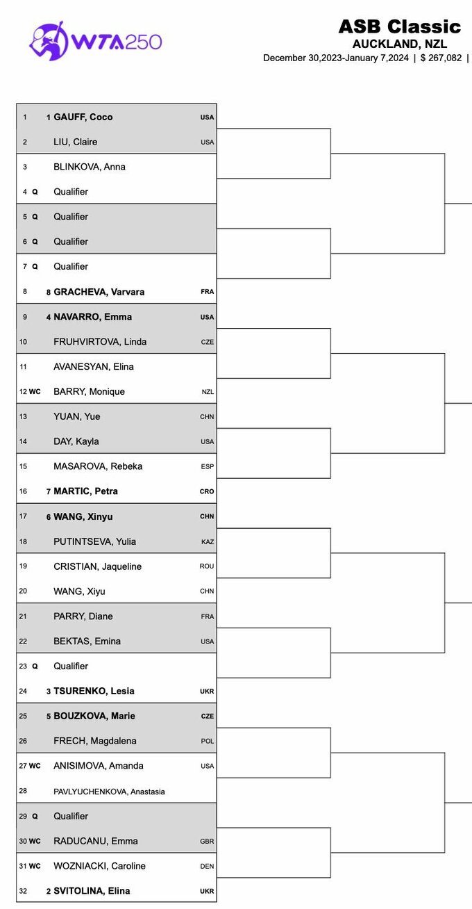 Main draw in Auckland (WTA 250), where Coco Gauff and Elina Svitolina are the top seeds.