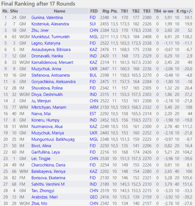В женской секции Анна Музычук смогла войти в топ-10, завершив турнир на девятой позиции. Одно из двух поражений украинка потерпела в последнем, 13-м туре в партии с Валентиной Гуниной, которая в итоге стала чемпионкой мира. «Нейтралка» на пол-очка опередила ставшую второй Александру Костенюк, которая выступала под флагом Швейцарии. Замкнула первую тройку китаянка Чжу Цзинер.