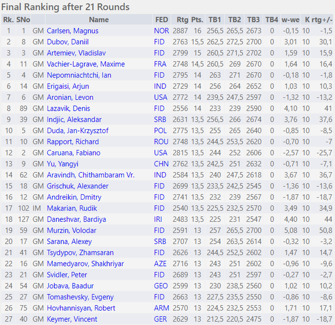 Скандинав долгое время был в роли догоняющего, но в последних турах «швейцарки» с 21-го тура смог догнать лидера, Владислава Артемьева. А после поражения «нейтрала» в 18-м туре от серба Александара Индича Карлсен вышел в лидеры и в оставшихся трех партиях победой и двумя ничьими отфиксировал успешную защиту титула, который выиграл в седьмой раз в карьере.