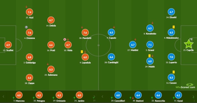 Украинский полузащитник «Эмполи» Виктор Коваленко начал матч в стартовом составе и провел на поле 84 минуты, после чего был заменен на Ардьяна Исмаили. Статистический сервис WhoScored оценил игру украинца в 6.5 балла.