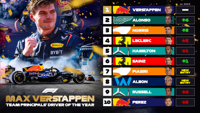 Руководители команд Формулы-1 в конце года приняли участие в опросе на лучшего пилота сезона-2023. Каждый гонщик получил определенное количество баллов, а затем сформировалась таблица топ-10.