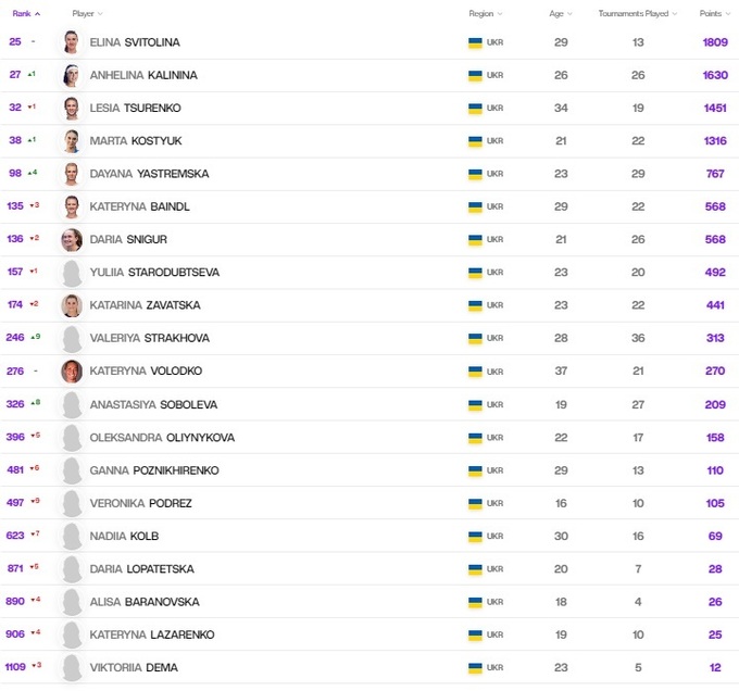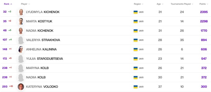 Элина Свитолина cохранила свою позицию, Ангелина Калинина и Марта Костюк поднялись на одно место. Леся Цуренко одну строчку потеряла.