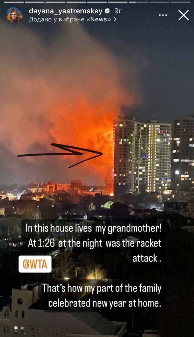 Украинская теннисистка Даяна Ястремская сообщила, что в новогоднюю ночь дом ее бабушки в Одессе пострадал от очередного обстрела российской армии.